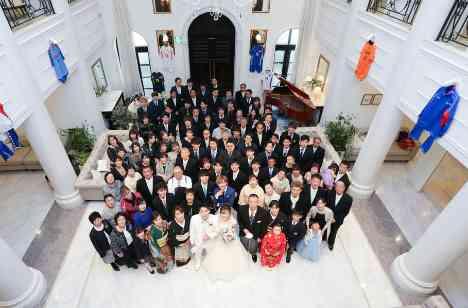 ハンドボール部だったご新郎様のこだわりが詰まったロビー。今までの懐かしいユニホームをお持ちくださりロビーに飾りました。思い出が詰まった大切なものを飾り、ゲストに見ていただく。そして大切なものと大切なゲストが集まる空間で、特別な集合写真を撮影しました。