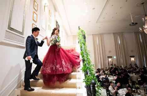 お色直しはシンデレラ階段からのご入場しました。シンデレラ階段からのご入場は、大切なゲストの皆様全員に幸せなお姿を全員にご覧頂けます。赤のドレス姿でのご入場のお時間は、皆様が自然と笑顔になりほっこり温かさに包まれるお時間になりました。