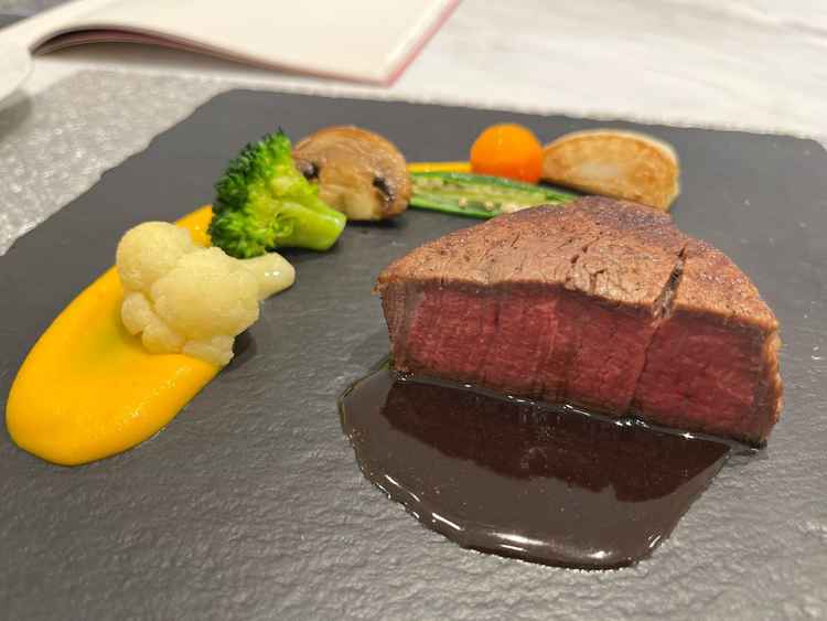 黒毛和牛ステーキを試食したが、オシャレすぎない味でとても美味しかった。