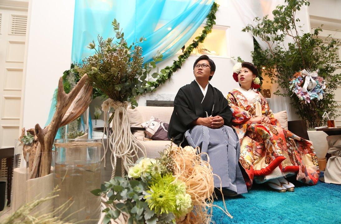 挙式はおふたりの航海の始まりを意味する”オーシャンリースセレモニー”とし、ゲストにもご協力いただきリボンリースを完成させました。