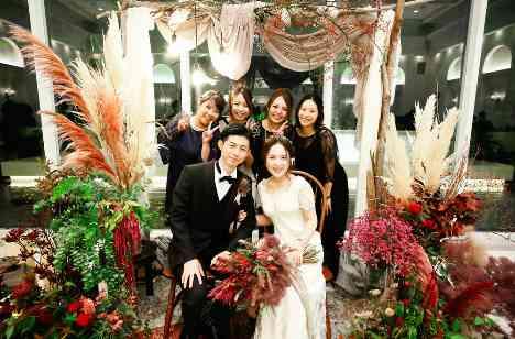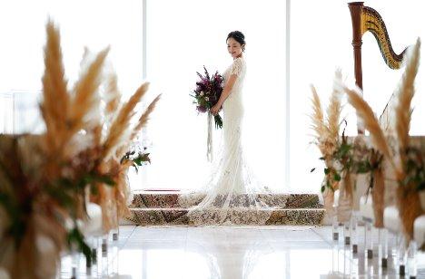 元アパレル勤務のおしゃれな新婦様とフラワーコーディネーターで一緒に創り出す空間は、参列するゲストもオシャレを楽しめる一日だからこそ、ゲストの皆様が映えるように、お花はあえて使わない空間に。 新婦様のこだわりのブーケもより際立つ空間に。