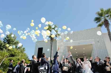 お打ち合わせでは、ゲストと一緒に楽しめる演出をというおふたりのご希望のもと、エントランスでのバルーンリリースを行うことに!この日は、最高のお天気でバルーンリリース日和!色とりどりのバルーンが青空に映えてゲストの皆様からも歓声があがりました!その後の撮影した全員での集合写真でも、みなさま笑顔でとても良い一枚を記録に。