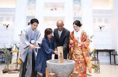 ケーキ入刀ではなく、餅つきで大盛り上がり