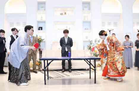 卓球のお仕事をされているおふたりは、卓球がきっかけで出会い、学生時代からずっと続けている事でもあり、共通点。ゲストにも卓球関係の方々がお越しいただいていたため、おふたりらしさ。をみなさまにも知っていただくため卓球大会を開催!5点先取制で、、、ラストは新郎新婦で対決!そして、卓球台は演出後もパーティー会場内で、ゲストが自由に楽しまれていました!