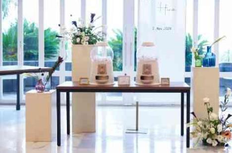 ロビーから、海が見えるコンサバトリーへ進むとワクワクするアイテムが・・・!おふたりからのサプライズアイテム♪幼いころを思い出す、懐かしいガチャポンをウェルカムタイムに体験!中には披露宴中に使うアイテムが入っており、一つだけリンゴ柄の飴玉が!たった一人のラッキーなゲストの方へは「幸せのプレゼント」がおふたりから送られました。