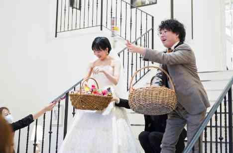 おふたりの「3.2.1スタート」の掛け声で挙式後にはお菓子まきを!「菓子まき」とは、新婦が家を出るときや新郎の家に入る際に、家の屋根や2階からお菓子をまき、幸せのお裾分けをする、という意味合いのある風習。小さいお子様から、ご親族まで大盛り上がり!あいにくのお天気でしたが、広々としたロビーの当館でゆったりとしたセレモニー時間を過ごされました