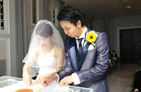 ロビーでゲストに太陽を作ってもらいました。Tシャツもゲストに晴れの日をイメージしてもらえるようにお二人と考えていきました。ゲストにもお二人のテーマを感じてもらうことで結婚式に一体感が出ると思い人前式を提案し、結婚証明書をゲスト参加型の演出を行いました。お二人も最後にご自身のイニシャルを貼ってSUNNYの文字を完成させお二人とゲストで作る結婚証明書は一生の宝物になったと思います。