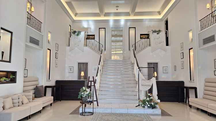 海外リゾート気分。写真映え抜群な、青と白が美しい明るくておしゃれな邸宅 | ニーズ静岡ベイ by T&G WEDDING(旧 ベイサイド迎賓館 静岡)