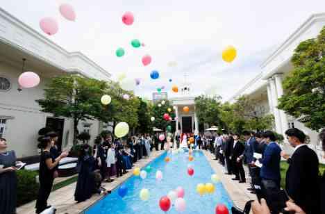 全員が参加して楽しむことのできるような演出をしようとお打合せの際から一緒にお話をしていました。 大きなプールを使って1人1球バルーンをお持ちいただき、プールを彩っていただきました。 実は少しお時間が経つと空へ向かっていくバルーン。 皆様に願いを込めていただき、青空に皆様の想いが届いた瞬間でした。