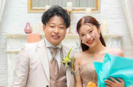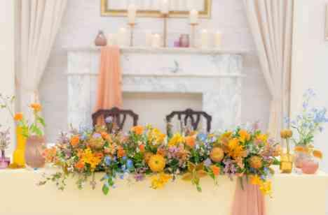 お2人の大好きなオレンジ系のカラーでまとめた装飾。太陽のようなお2人を表していて気分が上がる装飾にしました。太陽のような黄色やオレンジをイメージした色味を使用しました。メイン席で撮影したゲストとのお写真は、皆様笑顔溢れる素敵なお写真となりました。2人の笑顔と相まってよりいっそう華やかになりとても喜んでいただけました。