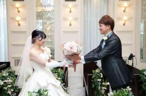 ファーストミート後にご新郎様よりご新婦様へサプライズで花束をご用意しました。 思いがけないサプライズにとても驚くご新婦様。 当日はお互いにサプライズをしかけており、お互いを思う気持ちが表れた素敵なシーンとなりました。 ご新婦様の雰囲気を表したような淡いピンクのバラの花束でとても喜んでいただけました。