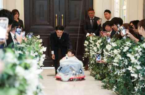 釣りが大好きなご新郎様。 当日はご新郎ご新婦様の大好きなお子様をリングボーイとして登場させました。 ご新郎さんの釣り竿で引っ張りたいという希望で、歩行器に乗ったリングボーイ君を釣り竿でくるくる巻き上げました。お2人のもとまで移動するリングボーイ君は皆様に見守れながらしっかりとお2人のリングを届けてくれました。