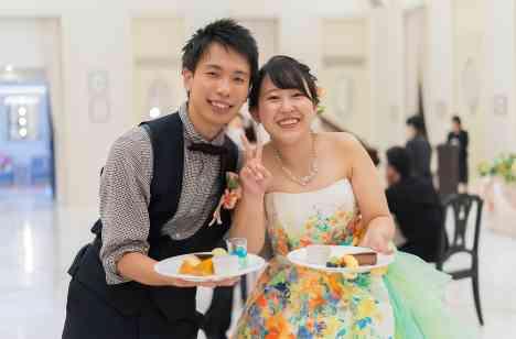 親族のみだからこそ食事を最後まで楽しみたい!そんなお二人の想いを大切に披露宴会場内でデザートビュッフェをご提案しました。お食事中もゲストのお席に座ってゆっくりとお話をしながらお食事も楽しんでおりました。そして、いよいよデザートの時間。お腹も一杯かと心配しておりましたが、お二人自身自らビュッフェに参加!お話して下さっていた通り最後までお食事を楽しんで下さいました。