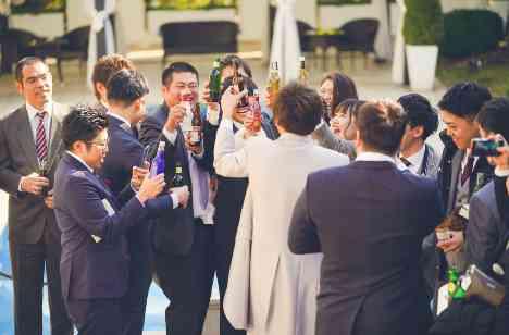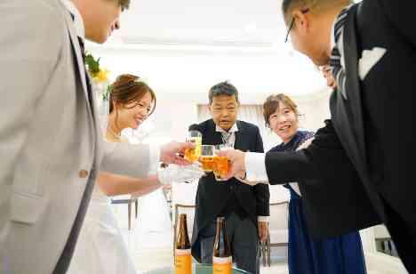 「GoodBeat!」というテーマを感じて頂くために、挙式でもおふたりらしさを大切にご提案していきました。 おふたりの明るさとお酒が大好きなところ、そしてゲストの方々との一体感を感じて頂けるように、誓いのキスの代わりに大好きなビールで乾杯! 笑顔溢れる人前式になりました。 アクアガーデン迎賓館の完全貸切だからこそ、カジュアルなパーティをご希望の方もおふたりらしさ全開で愛を誓って頂けます。