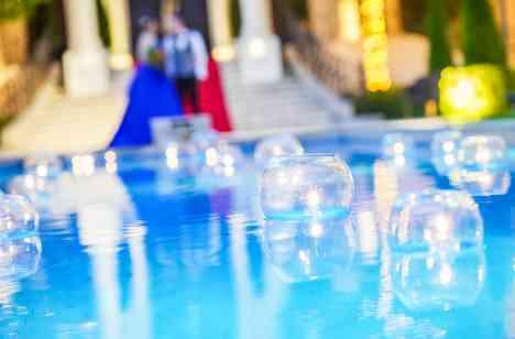 ご披露宴の中でふたりを彩った演出の中で、ゲストの方々から大好評だったのが、プールに浮かんだキャンドル。 アクアガーデン迎賓館のプライベートガーデンの中でキラキラ輝いていました。 貸切の空間だからこそ、ゲストの方々がお越し頂いた際は明るい陽射しが差し込むガーデンを、披露宴終盤にはドラマチックな景色にしてくれるプールキャンドルを飾ることができます。 おふたりの笑顔をキラキラ照らす演出です。