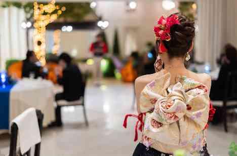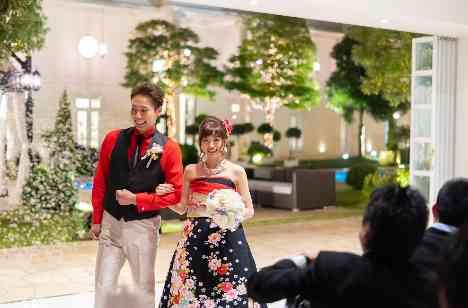 大切なお着物を結婚式の日にアレンジを加え、お色直しでお披露目!日本の伝統衣装をまとう姿を見たい親御様やご親族様、また、普段あまり目にしないオリエンタル和装姿に喜ばれるゲスト!アクアガーデンならではのガーデン入場とともに、華やかなシーンとなりました♪