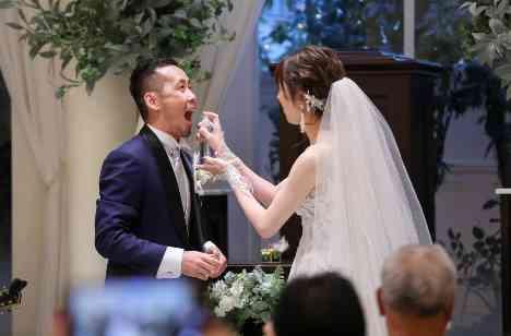 お2人のスタイルは人前式。ゲストの方々に向かって愛を誓います。立会人には大切なご友人を。お互いのご友人が誓いの言葉を問いかけます。アットホームで和やかな雰囲気の中で、いよいよ誓いのキス。ご新郎様のキスを避けるご新婦様。会場が騒然とする中で、ご新郎様の口に口臭スプレーを振りかけるご新婦様に会場は笑顔に。ゲストの方々を笑顔にしたい。そんなおふたりの想いが詰まったコント風誓いのキスでした。