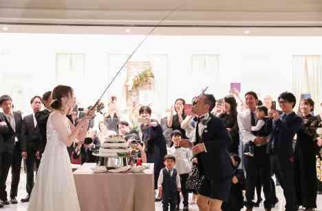 アウトドアが大好きなおふたりが取り入れた演出の中で、ゲストの方々の笑顔を誘ったのがファーストバイト。お互いにケーキを食べさせあうこの進行で、ご新婦様が取り出したのはご新郎様の趣味である釣りにちなんだ釣り竿。先についたお玉でケーキをすくい、ご新郎様の元へ!ゲストの方々も笑顔でその様子を見守り、お写真を残しました。