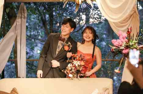 日が沈みはじめガーデンがライトアップされる、 ロマンチックなトワイライトタイム。 目の前に大自然を感じる2階のテラスで、 熱々のお茶漬けビュッフェを楽しみながら、 思い思いにゲストと過ごしたおふたり。 歓談や写真撮影などリラックスした雰囲気の中で、 楽しそうな笑い声に包まれた披露宴になりました。