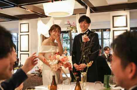 披露宴の際には、お料理のメニュー毎に一卓一卓テーブルをまわったおふたり。 ゲストと一緒に料理を食べながらより近い距離で会話を楽しみました。 おふたりが主役。ではなく、 ゲストと同じ目線でみんなで一緒に楽しめるように、 おふたりらしい演出でおもてなしをしました。 大切なゲストだからこそ、 結婚式当日もお一人おひとりと顔を合わせて言葉を交わします。