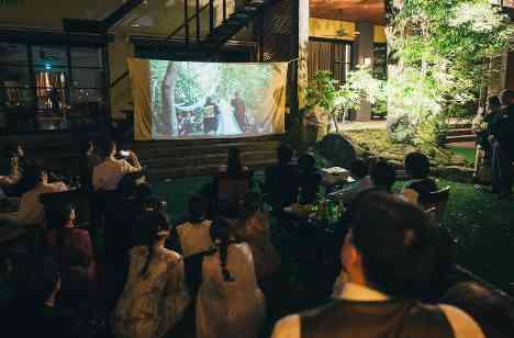 夜のガーデンでご友人やご親族と語り合っているおふたりの姿は特に印象的でした。 非日常でラフな空間は、普段あまり接点のない友人同士の自然な会話を生み 新たな繋がりが生まれるきっかけにもなりました。 今までのおふたりの写真やゲストとの写真を布のスクリーンで流す、 「思い出の投影」も、会話の糸口としてとても効果的で ゲストの皆さまもリラックスして交流できました。