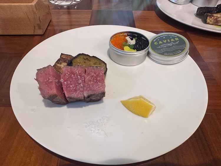 ナンザンハウス名物のキャビア缶、近江牛サーロインステーキをいただきました。 料理説明もわかりやすく、味も非常に美味しかったです。