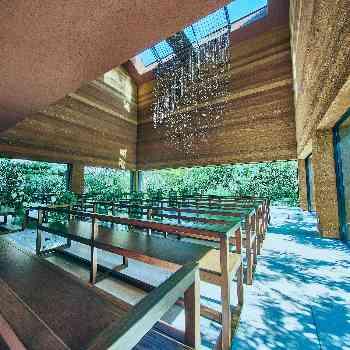 鮮やかな緑に囲まれた独立型チャペルの壁面は、伝統と温かみを感じる印象的な左官仕上げ。天窓からは自然光が降り注ぎ、光を浴びたオブジェがきらきらと輝きます。