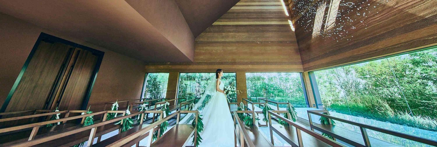 - 天窓から注ぐ光や左官仕上げの壁面。グリーンビューの絶景と光のオブジェの下で誓う温もり溢れる感動挙式。