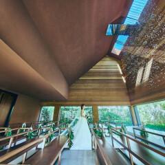 【瑞々しい緑に囲まれた印象的な独立型チャペル】天窓から降り注ぐ光で輝く「光のオブジェ」や日本古来の伝統技術の「左官仕上げ」が印象的。温かさと幻想的な雰囲気を併せ持つチャペルはゲストの記憶にも残るはず。
