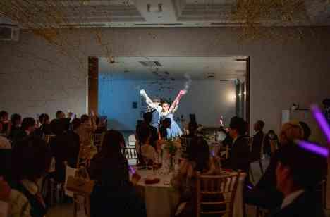 お色直し後の再入場では、会場の注目を集める巨大バズーカーを使ったインパクト抜群の演出を取り入れました。扉が開いた瞬間からゲストの期待感が高まり、バズーカーから放たれた演出に会場は大きな歓声と拍手に包まれました。サプライズ感ある登場は、披露宴の雰囲気をさらに盛り上げ、おふたりらしい楽しく華やかなワンシーンに。ゲストの記憶にも残る、印象的な再入場となりました。