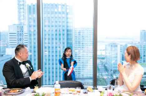 娘と友人の子供に歌とダンスの披露をお願いしました。 たくさん練習した余興をみんなに見せることができ、 娘たちも達成感でいっぱいでした。 大人ゲストも元気いっぱいの子供たちを見て 笑顔になってくれていたので、余興を入れてよかったと 思いました。少人数の会場でしたが、 余興のスペースが取れて、盛り上がる事ができました。