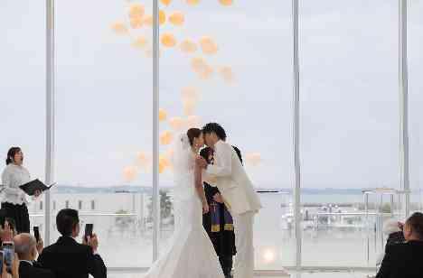 挙式はお二人にとっても一生に一度の大切な瞬間。その中でもウェディングキスはお二人にとってもゲストの方にとっても記憶に残る瞬間です。だからこそ、キスの瞬間にバルーンを飛ばす演出を加え、よりお二人にとって記憶に残る一瞬を創出しました。また、お二人は大好きなワンちゃんと生活していたため、リングを運ぶ大役にはワンちゃんにお願いを。お二人らしさがあふれる挙式となりました。