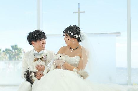 大好きなペットも家族の一員と考えるお客様が多い中で 「リングドッグ」は増えている演出ですが おふたりに合わせて「リングキャット」を登場させるシーンを創りました。 挙式前にはかわいいネコちゃんとおふたりで一緒に撮影する時間も設け 一生に一度のドレス姿で可愛らしい家族写真を残すことが出来ました。