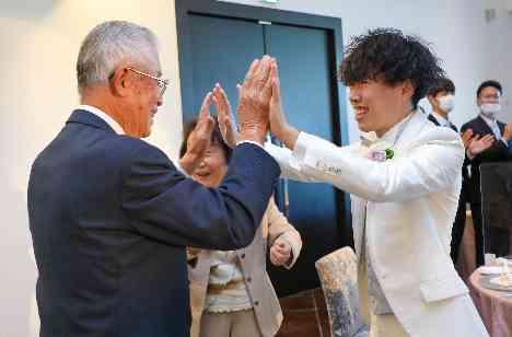 ご新郎様ご新婦様の出逢いが陸上部であったということもあり 結婚式にも「陸上」をひとつのポイントとして創り上げました。 中座のシーンではゲストの皆様にも参加していただき ご友人様にバトンを繋いでいただいたり ゴールテープを扉前で持っていただき ご新郎様がゴールするという新たな中座を行いました。