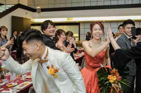 大好きなゲストの中を二人が自由に動き回る! ゲストもスタンディングでお迎え! ハグ! グータッチ! ハイタッチ! 盛り上げ上手な友人様 ハグしてなかなか離さない新婦友人様 感極まって熱いハグをする新郎と家族 一体感を全身で感じながら 大好きな曲に身を任せ まさに自由に過ごす最高のひととき!