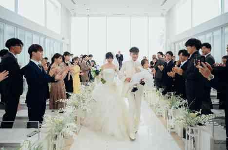 当日は快晴とまでは行かない天候でしたが、自然光がしっかりと入る挙式会場の中で皆様にしっかりと見守られながら挙式が行われました。お二人のお子様もリングを運んでくださる大役に抜擢され、本番は泣いてしまいましたがご新郎様に抱っこをされながら無事に届けていただきました。神聖なキリスト教会式ではありながらも明るさがある分、どこかリラックスした雰囲気の中で挙式が行われていきました。