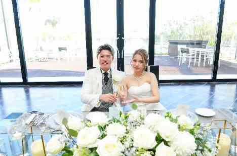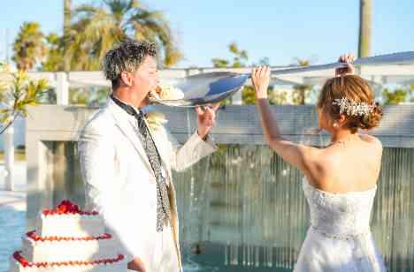 会場の開放的な空間は挙式会場だけではなくご披露宴会場にも広がっております。テラスが併設されているためお二人はケーキ入刀をテラスで行いました。ゲストの皆様もケーキの近くまでスマホを持って近づいて、お二人もより笑顔が感じられたのではないかと思います。そしてご新郎様は特大のスプーンでケーキをパクリ。ゲストの皆様も笑いと驚きに溢れて一体感のある瞬間となりました。