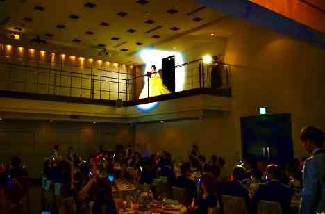 お色直しの入場はおふたりそれぞれ別の場所からのご入場。 ライブのようにゲストの皆様にはペンライトを持っていただきました。実はこのペンライトの色はご新婦様のお色直しのドレスの色当ても兼ねておりましたので、扉が開いた瞬間はゲストは歓声も上げて、盛り上げてくださいました!