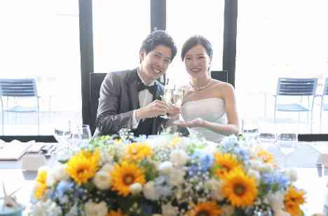 ひまわりが好きなお2人。淡いブルーをさし色に、会場のお花やブーケもイメージを統一しました!小物アイテムに貝殻なども飾り、当日は真夏の晴天のなか、すこし涼しさを感じるコーディネートを目指しました。また、フラワーのお打ち合わせが行われたのは5月頃でしたが、お2人と一緒にスタッフも夏の気分を味わいながら盛り上がっていました。