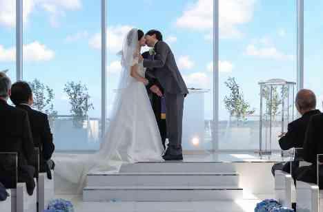 教会式にて執り行いました。この、快晴の青空のもと奇跡の1枚をおさめることができました!このひにしかない、雲の動き、青空の色もすべてがおふたりの貸し切りになりました。開放的な空間の中、自然とゲストの皆様にも笑顔が生まれアットホームな雰囲気のなかでの挙式となりました。