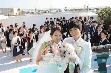 お2人が大好きな愛犬「キーさん」と、大好きなゲストの皆様に囲まれて行う挙式後のセレモニーは、お菓子まき♪楽しんでいただけるか、準備中もどきどきでしたが、本番は、緊張が解けた瞬間のとっても楽しそうなみなさまの笑顔が、青空の下きらきら輝いていたのが印象的でした