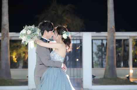 披露宴が結ぶころにはゆっり日が沈み、サンセットの雰囲気に包まれました。また、二次会までのお時間でお2人だけの専用ガーデンにて、フォトシューティングを行いました。余韻が漂う中、ナイトならではの大人っぽく落ち着いた空気間ででした。