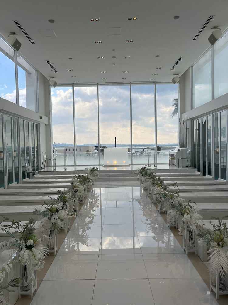 挙式会場はとても神聖な雰囲気でした。会場の外は少しペンキが剥がれているところがあり少し残念でした。建物の外は水で囲まれていたため、リゾートの雰囲気が出ていてよかった。