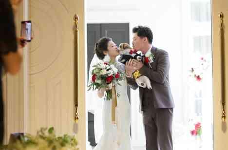 おふたりは家族の一員である、ワンちゃんと過ごすご結婚式を夢見て、北山迎賓館にお越しくださいました。大切なワンチャンと挙式のお時間を過ごされ、退場シーンではおふたりから愛情のこもったキスをワンちゃんに送られました。挙式でのワンちゃんのご登場で、あまりの可愛さに、ゲストの皆様からも思わず声がもれる瞬間も。