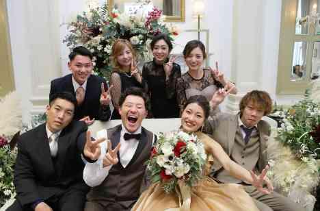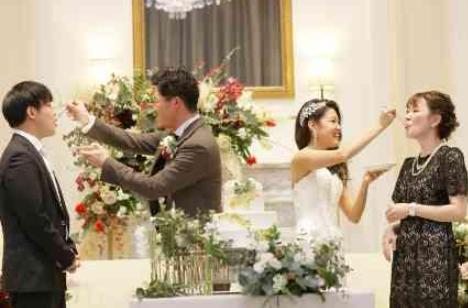 披露宴がスタートした瞬間からおふたりの元にかけ寄るご友人様たち。ご歓談のお時間には、たくさんのお写真を撮って、たくさんの仲間に囲まれ、溢れ出る最高の笑顔!「やっぱり地元は最高!」と久しぶりに過ごす仲間たちとのお時間は、この上なく幸せな瞬間がたくさん生まれていました。1秒でも多くの幸せな時間をつくるために、「距離感」にこだわりました。