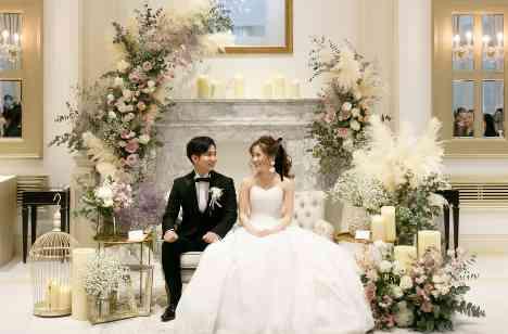 ゲストの皆様と、できるだけ近い距離間で一体感のある素敵なお写真を残すためにソファ席にしました! フラワーコーディネーターとのお打ち合わせではお好きな装飾のイメージ画像をお持ちいただき、おふたりだけのメイン席を創りあげました! 大好きなカスミソウやパンパスグラスをたくさん使用し、大人かわいいメイン席となりました!