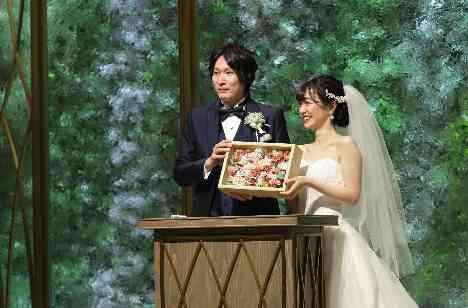 今日という日に皆さんの愛というお花が集まることで ひとつの大きな愛の花が咲く そんなコンセプトに基づき、ゲストと一緒に完成させるフラワーボックスの結婚証明書にご署名いただきました。 お好きな花を選んでいただきその花をボックスに咲かせていただきます。おふたりには蓋をしご署名していただいたら世界でたった一つだけの結婚証明書の完成です。