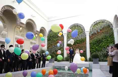 挙式が結んだ後はガーデンにてアフターセレモニーを行いました。 開放的なガーデンにある大きなプールとバルーンを使ってゲストの方をアッと驚かせます。 ゲストの元にわたったバルーンは手を放すのではなく、プールに投げ入れていただきます。数秒経つとバルーンが一斉に空へと舞い上がっていき、アッと驚いたゲストの皆様は自然と空を見上げます。