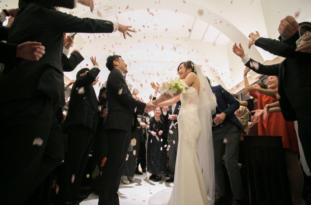 大切なゲストの方に囲まれてのフラワーシャワー。 皆様からのたくさんの愛情を浴び、おふたりもとても素敵な笑顔に。