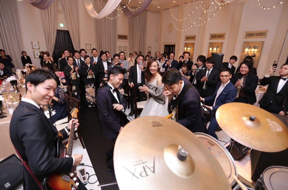 バンドマンだったご新郎様。当時を思い出し友人とご一緒に久しぶりの演奏をしていただきました。皆様にも前にお越しいただき、披露宴会場がライブ会場に。全員ひとつになった瞬間!